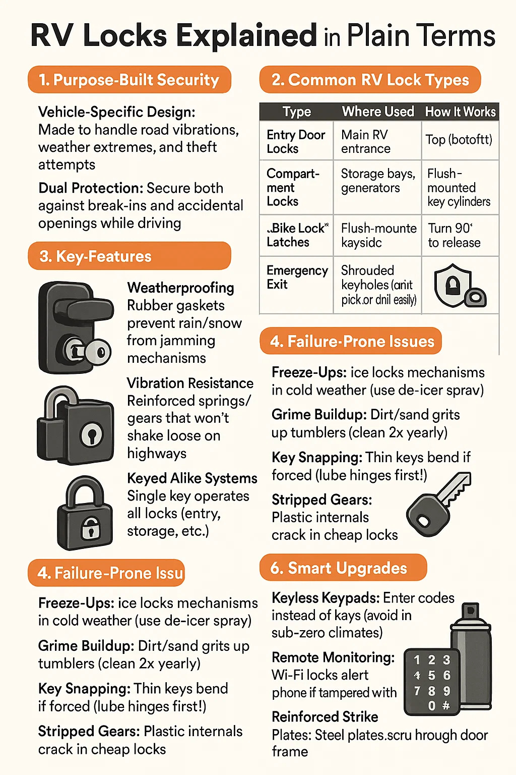 ล็อคประตูทางเข้า ทางเข้า RV หลัก สลักกลอนแบบใช้กุญแจ มักเป็นแบบดับเบิ้ลโบลท์ (บน/ล่าง)